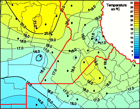 Mapa de temperaturas medias de las las últimas 48 horas.(Desde las 8:00AM hasta las 8:00AM). Se actualiza a las 10:00hs.