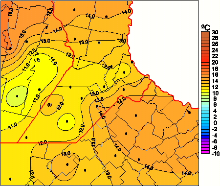 Mapa de temperaturas mínimas de las las últimas 72 horas.