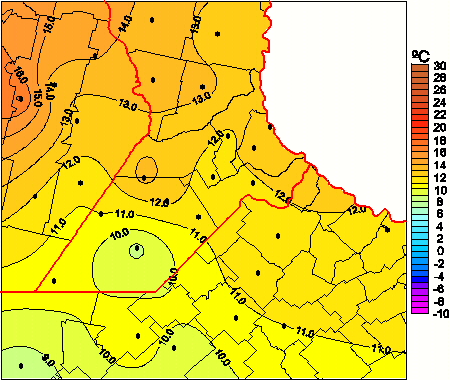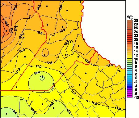 Mapa de temperaturas mínimas de las las últimas 120 horas.(Desde las 8:00AM hasta las 8:00AM). Se actualiza a las 10:00hs.