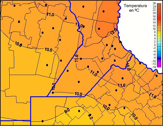 Mapa de temperaturas mínimas de las las últimas 96 horas.(Desde las 8:00AM hasta las 8:00AM). Se actualiza a las 10:00hs.