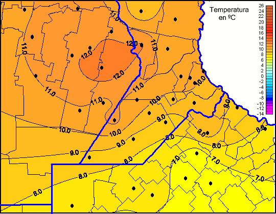 Mapa de temperaturas mínimas de las las últimas 120 horas.(Desde las 8:00AM hasta las 8:00AM). Se actualiza a las 10:00hs.