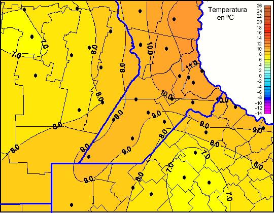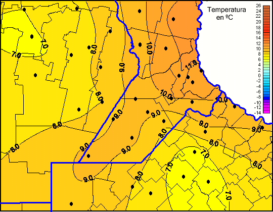 Mapa de temperaturas mínimas de las últimas 24 horas.
