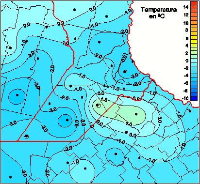 Mapa de temperaturas mínimas de las las últimas 96 horas.(Desde las 8:00AM hasta las 8:00AM). Se actualiza a las 10:00hs.