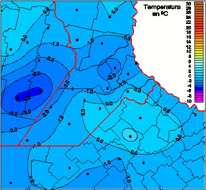 Mapa de temperaturas mínimas de las las últimas 96 horas.(Desde las 8:00AM hasta las 8:00AM). Se actualiza a las 10:00hs.