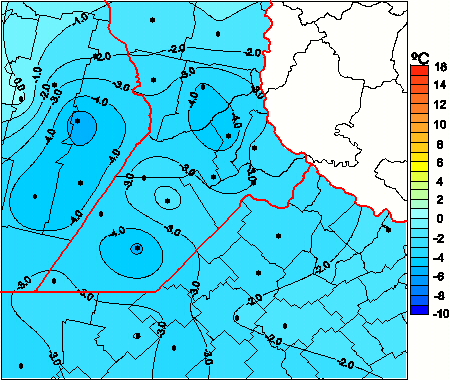 Mapa de temperaturas mínimas de las las últimas 96 horas.(Desde las 8:00AM hasta las 8:00AM). Se actualiza a las 10:00hs.