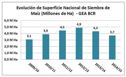 La superficie sembrada de maíz para la campaña 2014/2015 se estima en 3,67 millones de ha. Subsiste la posibilidad de ajustes posteriores en la medida que se analice la evolución de las labores de siembra de noviembre y diciembre y cómo se den las condiciones para la implantación del maíz de segunda. De esta manera la superficie nacional de maíz caería respecto al ciclo pasado en un 16,7%.
