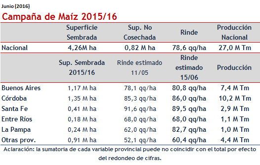 En esta estimación, se ajustó al alza el rinde promedio nacional, pasando de 76,7 qq/ha a 78,6 quintales. Se conserva el guarismo del área total sembrada nacional en 4,26 M ha. Pero se ha modificado las hectáreas para otros destinos distintos de la cosecha para comercializar, que disminuye de un millón de hectáreas a 820 mil. De esta manera, la producción nacional es estimada en 27,0 millones de toneladas.