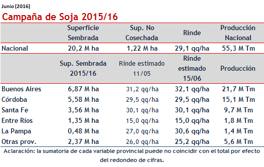 Se efectúa una leve alza en la estimación de soja 2015/2016, pasando de 55 a 55,3 millones de toneladas. Pero los ajustes positivos en rindes, en buena parte por la excelente campaña en Buenos Aires, están lejos de compensar las disminuciones acontecidas en la franja central. La recolección avanzó al 89% del total de la superficie a cosechar, con un área perdida que se estima en 1,2 M ha, frente a 1,1 millón calculada en el informe previo.
