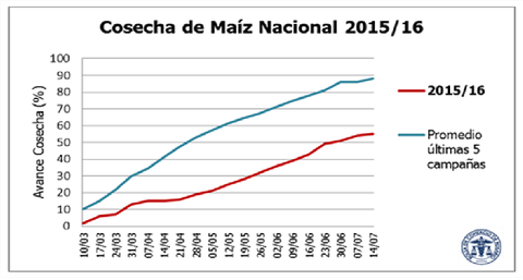 En soja y maíz el progreso de la cosecha de la campaña 2015/16 confirma las expectativas de las estimaciones que señalan una producción de soja de 55,3 M de tn y en maíz de 27 M de Tn. El avance de la cosecha en soja es de 98%. Pero en maíz, el retraso es cuantioso, apenas pasa de los 55 % del total nacional. En Córdoba aún siguen en pie 670 mil ha, y en Buenos Aires 380 mil ha. Respecto a esta misma altura del año pasado, una colecta muy trabada también, la cosecha nacional está un 16% por debajo. Pero comparándola con el progreso promedio de los últimos 5 años queda por debajo en un 33%.