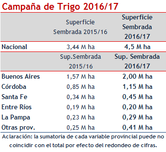 Si bien los guarismos de superficie del trigo 2016/2017 seguirán revisándose mensualmente, hasta llegar a la configuración final, en el presente informe se estima un área total de 4,50 millones de hectáreas, lo cual es un 31% superior a los 3,44 millones de hectáreas cultivadas en la campaña anterior.