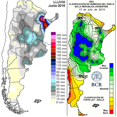 Llama la atención cómo el clima está contrariando el patrón invernal, causando la imposibilidad de concretar siembras por problemas de excesos hídricos. Los últimos diez días de junio, y los primeros de julio, volvieron a acentuar los problemas en los accesos de los lotes, la falta de piso y los niveles de napas, otra vez, alcanzando sus máximos picos. La situación de esta campaña es comparable a lo que sucedía hace dos años, en la siembra del trigo 2014/15, cuando los excesos quitaron de las siembras 160mil ha. Las intensas lluvias recibidas sobrepasaron por lejos las medias mensuales de los 20 a 40 mm. Aparte, llegaron en grandes cantidades a una gran extensión del oeste, cuando suelen recostarse sobre el este del país. Esto se observa en la imagen de la Consultora de Climatología Aplicada -CCA- y explica los problemas de recolección y siembra.