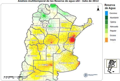 Al fin de julio, se puede notar en la imagen de agua en el suelo (ver al final del informe) cómo han sido favorecidas las zonas del centro este de Cordoba, el noreste de Buenos Aires, y sobre todo en esta provincia se destacan las muy buenas reservas del sur, sobre todo en las áreas de Pigué y Tres Arroyos. Las principales zonas trigueras cuentan con las condiciones de humedad adecuadas para proseguir las actividades de siembra y, de hecho, hay algunos problemas con excesos de humedad que han retrasado las tareas de implantación, sobre todo en el área tandilense. Los perfiles del suelo del sur de Santa Fe, sur de Córdoba, sur de Entre Ríos tienen niveles de humedad entre suficientes y escasos, pero, en general, la baja demanda atmosférica propia de la estación y las lloviznas que han recibido, mantienen las condiciones adecuadas para el crecimiento del cereal. Pero, de mantenerse las altas temperaturas que vienen registrándose por encima de las medias estacionales, serían muy bienvenidas lluvias de entre 20 y 40 mm. El NEA y una buena parte del NOA siguen acusando los serios problemas de déficit hídrico que arrastran desde el verano. Esto también ha sido un elemento fundamental que contribuyó a la notable baja en la intencionalidad de trigo en esta campaña. Sólo en el este chaqueño y la provincia de Santiago del Estero muestran una recuperación y reservas adecuadas en los suelos.