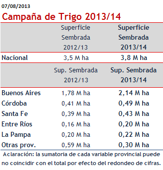 Si bien los guarismos de superficie del trigo 2013/2014 seguirán revisándose mensualmente, hasta llegar a la configuración final, en el presente informe se estima un área total de casi 3,8 millones de hectáreas, lo cual es poco más de un 7% mayor a lo cultivado en la campaña anterior.