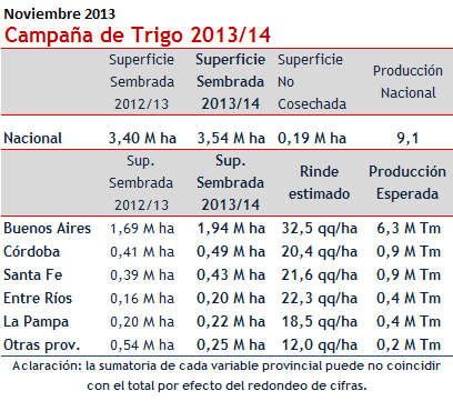 Se realizó un ajuste a la baja en la cifra de la superficie destinada a trigo 2013/2014, con respecto a la anterior estimación, recorte equivalente a un 7% y que deja el área en 3,54 millones ha. Gran parte de la caída obedeció a que no lograron concretarse las intenciones de siembra iniciales.