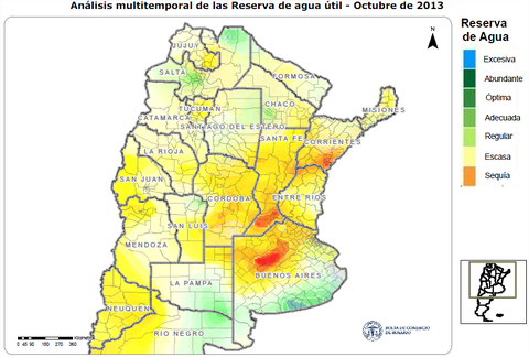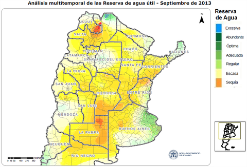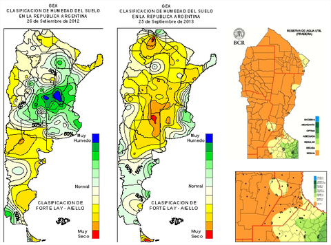 En lo que se refiere a lluvias, setiembre se comportó como julio. La distribución fue típica de un mes de invierno, con precipitaciones recostadas sobre el margen este del país, cuando setiembre es un mes en el que comienzan a desplegarse las lluvias importantes sobre el oeste, y que suelen constituir las reservas de humedad en los suelos. Se destaca el desenvolvimiento de las precipitaciones en el este y sur bonaerense que recibió precipitaciones incluso por encima de los valores históricos. En las imágenes siguientes se ve con claridad cómo estaban las reservas de humedad a fines de septiembre de este 2013, con relación a fines de septiembre de 2012. Por otra parte, se hace la misma comparación de comportamientos, pero enfocando la escala en la zona central.