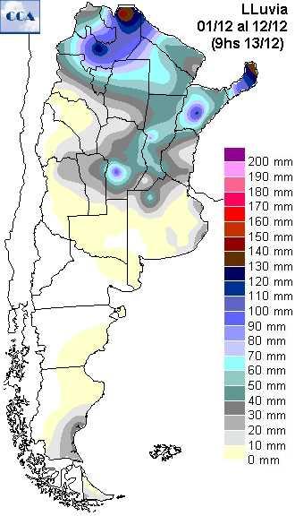 Diciembre no ha sido bueno pese a que la primera década dejó lluvias intensas en una franja del centro de Santa Fe, y epicentros de lluvias en el sur de Córdoba y noroeste bonaerense. Hubo acumulados moderados a escasos en el centro y norte de la región pampeana (ver gráfico). A partir de esa fecha se ha cerrado el patrón de humedad que había cobrado fuerza en noviembre y había permitido rebatir la falta de agua que se extendía desde el invierno. Han vuelto, por lo tanto, los problemas para avanzar con las siembras de maíz. Las reservas superficiales están agotadas y son muy pocas las áreas donde continúan las siembras de segunda.