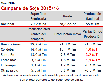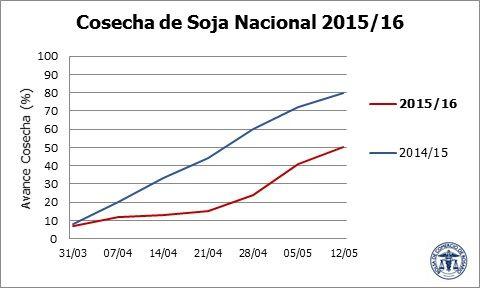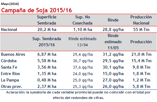 A la primera semana de mayo, el avance de la cosecha de soja cubre el 50% del área, 30 puntos por debajo del año pasado. Con nuevos datos de rendimiento es posible ajustar la cifra estimada de producción a 55,0 millones de toneladas, casi 7% por debajo del guarismo del informe de abril. Se parte de considerar una superficie sembrada de 20,2 millones de hectáreas, una superficie perdida de 1,1 M de hectáreas –esto es, 300 mil ha más que hace un mes- y una productividad promedio nacional ajustada a 28,8 qq/ha -2 qq/ha menos que en el informe anterior.