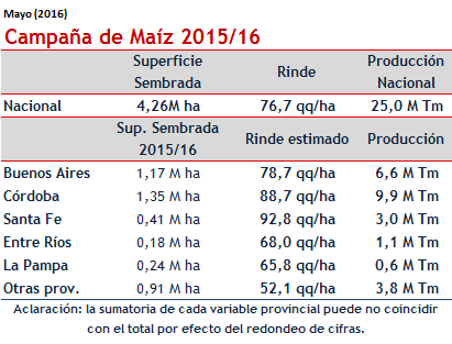 En esta estimación se sigue considerando un rinde promedio nacional de 76,7 qq/ha, conservando el guarismo del área total sembrada nacional de las 4,26 M ha, de las que se resta un millón para otros destinos distintos de la cosecha para comercializar. De esta manera, la producción nacional es estimada en 25,0 millones de toneladas. De todas formas nuevas inquietudes podrían traducirse en bajas productivas.