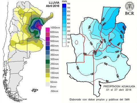 Desastre pluvial sean, tal vez, los términos que mejor describen el mes de abril de 2016. Tras un deficiente mes de marzo en cuanto a precipitaciones, durante abril la atmósfera se cargó constantemente con la humedad proveniente del Pacífico y se desahogó, también constantemente, sobre el centro de Argentina. El centro de baja presión, tenazmente estable, no cedió hasta la última semana del abril y marcó el destino de la producción completa de la oleaginosa de dos provincias, la de Santa Fe y Entre Ríos, y en forma parcial sobre la de Córdoba, particularmente la franja este provincial. Sectores contiguos, como el norte de Buenos Aires, las provincias de Corrientes, Chaco y Santiago del Estero, se vieron también afectados pero con impactos menores. (Ver las imágenes de precipitaciones; la primera confeccionada por CCA —Consultora de Climatología Aplicada—, y la segunda, concentrada en la región pampeana, por esta misma Bolsa de Comercio de Rosario, con datos de la red GEA y del Servicio Meteorológico Nacional.