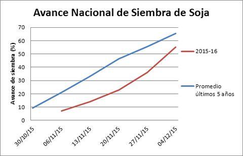 Con problemas por las lluvias de noviembre y diciembre, se han sembrado casi 11,3 M de ha con soja, lo que representa el 55% del total intencionado. Pese a los problemas de excesos, las últimas lluvias alcanzaron las zonas más mediterráneas y fueron oportunas para el avance de la siembra de soja. Con 20,5 M de ha de soja en el ciclo 2015/16, se puede proyectar la producción en 55 M de toneladas.