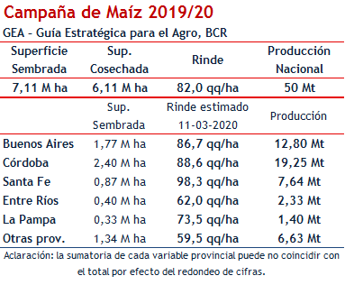 Por eso se mantienen sin cambios las cifras para maíz del mes pasado, afirmando que la campaña maicera 2019/20 alcanzaría con 50 millones de toneladas de producción su segundo mejor nivel productivo. De esta manera, el rinde nacional sigue estimado en 82,0 qq/ha. El número de producción se compone también de un nivel de siembra de 7,11 M de ha y una superficie destinada a grano comercial de 6,11 M de ha.