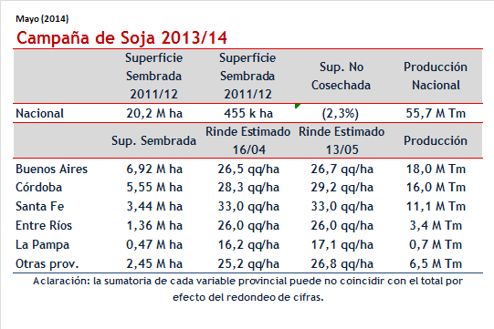 Se ajustó el área de siembra con soja de Salta, reduciéndolo de 500 a 450 mil ha, razón por la cual el total de siembra nacional disminuye. Tucumán y Salta dejaron atrás la peor campaña de su historia, la 2012/13, obteniéndose ahora rindes notoriamente mejores aunque inferiores a los niveles históricos (entre 27 y 30 qq/ha). Este año se obtendrían 24 y 23 qq/ha, como promedio provincial en cada una de ellas.