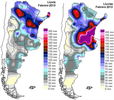 A pesar de las mejoras, se mantuvieron tanto la irregularidad como los comportamientos deficitarios de las lluvias sobre numerosas zonas productivas en la segunda mitad de febrero y en lo que va de marzo. Si no se hubiera contado con las lluvias records del primer semestre de 2012, probablemente estaríamos en un escenario más grave que el del año pasado cuando se perdieron 10 millones de toneladas por la sequía asociada a los efectos de “La Niña”. Comparando los totales pluviométricos de febrero del año pasado y este año en las imágenes que elabora la Consultora de Climatología Aplicada (CCA) (ver imágenes debajo) se aprecia que la cobertura tuvo un patrón mucho más estrecho, sobre todo en el centro, sur y oeste de la región Pampeana. También el volumen recibido de agua fue notoriamente inferior y ha sido un hecho negativo que las recargas se produjeron en fecha más retrasadas y por ende, menos oportunamente para el cultivo de soja.