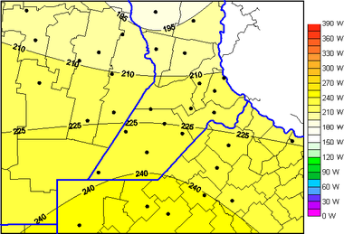 Se destacan dos epicentros. El primero en la zona de Bellville con 300 horas y el segundo en la zona de Rojas, Pergamino y Chacabuco con cerca de 260 horas. En el año 2008, estas marcas alcanzaron techos de 150 horas (ver el segundo mapa). Por lo tanto, se está ante un nivel de calentamiento en determinadas áreas geográficas en donde este índice se multiplico por 2 ó 3 veces.