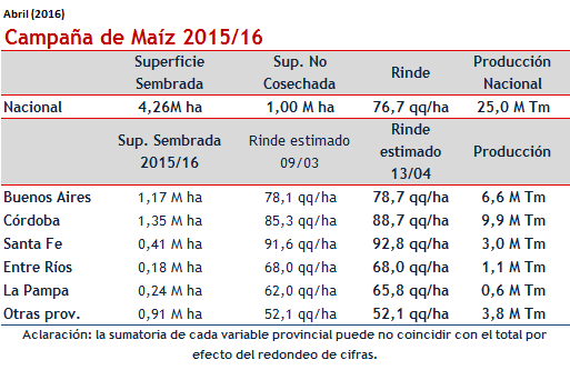Los ajustes positivos que más se destacan fueron los de las provincias de La Pampa y Córdoba, llevándolos a 65,8 qq/ha (3,8 quintales más que en la estimación de marzo) y 88,7 qq/ha (3,4 quintales más), respectivamente. En Santa Fe los rindes cosechados y las expectativas se ajustan con 1,2 quintales más. En Buenos Aires, el potencial de maíces siembra temprana y tardía posibilita incrementar en más de medio quintal el rinde unitario a nivel provincial. Se resumen los datos por provincia en el cuadro que sigue.
