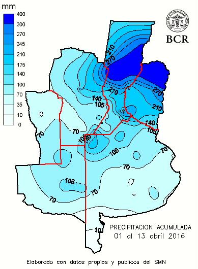En abril, las condiciones atmosféricas variaron abruptamente por un cambio de circulación y eso sumió a la región central en un temporal de lluvias. Hasta la mañana de este miércoles 13 de abril se registran acumulados de 70 a 270 mm en la región central, tal como puede apreciarse en la imagen: