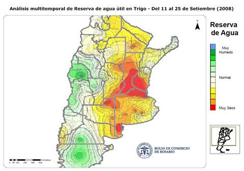 Contrariamente a las condiciones de mayo del 2007, esta campaña 2008/09 se iniciaba con una situación de falta de agua que se da “una vez cada 20 años”. Esa diferencia en la condición de “partida” se puede apreciar en los mapas de anomalías de la reserva de agua en el suelo para Argentina, el del 13 de mayo de 2007 y el del 13 de mayo de 2008. La siembra de trigo se iniciaba, entonces, con serias bajas de hectareaje y un moderado a severo ajuste de insumos en el plan triguero.