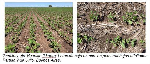 La siembra de soja se aceleró estas últimas semanas y cubre el 65% del área en San Antonio de Areco. 'Hay buenas emergencias, pero lentas. Los primeros lotes todavía no largaron la primera hoja trifoliada' describen los ingenieros. Hay algo de cortadora, pero no a un nivel de requerir control. 'La reservas en profundidad son adecuadas y la humedad en la cama de siembra es ideal. Se sembró lo más arriba posible, entre 1,5 a 2 cm de profundidad' comentan. 'Se hicieron ajustes en fertilización en la dosis o usaron productos más económicos como el súper fosfato simple (SPS) en dosis de 50 a 80 kg/ha' detallan los profesionales. El maíz está con muy buenas condiciones en el 100% del área en su estado vegetativo de 4 a 5 hojas expandidas. 'No hay mayor interés para la siembra de segunda del que ya había' comentan. Los lotes de trigos presentan una condición muy variada. Hay lotes regulares a bueno en un 15%, pero el 75% esta en muy buen estado y el resto está excelente. Se esperan rindes cercanos al promedio zonal: 32 qq/ha. 'Ayer a la tarde (9/11) y anoche hubo lluvias y granizadas de diferente intensidad. Todavía no hay reportes de daños en los cultivos porque no se puede llegar a los lotes' informan preocupados.