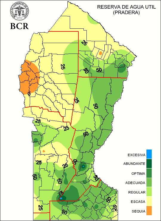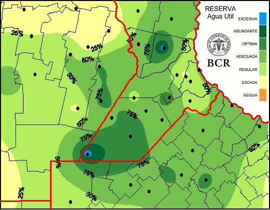Las lluvias registradas mejoraron notablemente la situación mostrando condiciones entre óptimas y adecuadas en la mayor parte de Buenos Aires y Santa Fe, sólo con algunos excesos puntuales, especialmente en Santa Fe. La provincia de Córdoba todavía mantiene características de humedad escasa, aunque las condiciones han mejorado notablemente.