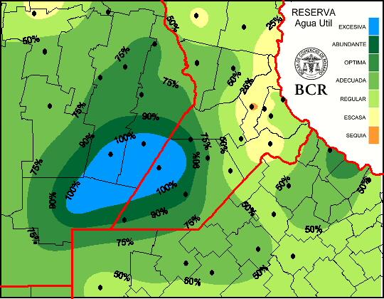 Las condiciones de humedad del suelo siguen siendo dispares. Hay excesos en zonas del sudeste de Córdoba y el sudoeste de Santa Fe y sectores con humedad escasa sobre el extremo sudeste de Santa Fe. Se observan condiciones entre adecuadas y óptimas sobre una importante porción de la región.
