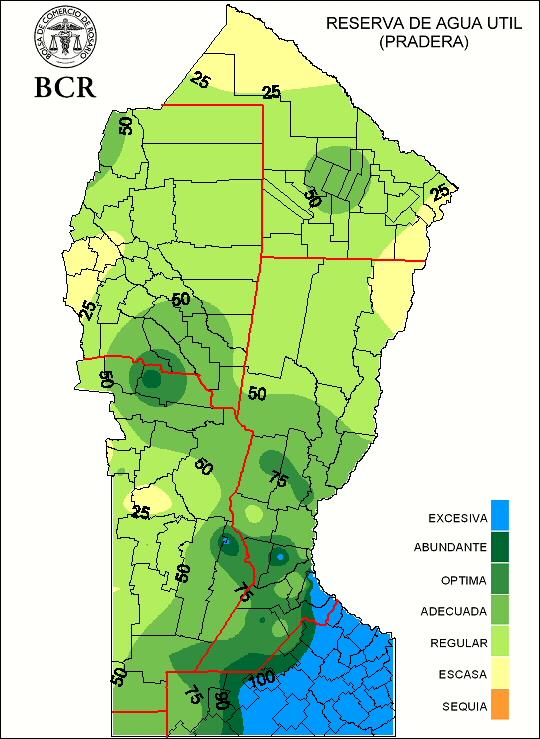 Las condiciones de humedad del suelo se han incrementado de manera muy significativa en la región GEA, con excesos sobre todo el noreste de Buenos Aires y el extremo sudeste de Santa Fe. Hacia el oeste, las reservas presentan una leve disminución, que las ubica entre abundantes y óptimas. Estas condiciones abarcan gran parte de la provincia de Santa Fe, pero en Córdoba se observan condiciones adecuadas.