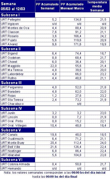 La semana comprendida entre el jueves 12 y el miércoles 18 de marzo comenzará un cambio de las condiciones, después de varios días de inestabilidad y precipitaciones en forma de chaparrones y tormentas intermitentes y aisladas. Desde hoy, jueves 12, se espera que el cielo presente una disminución de la cobertura nubosa, y un lento pero progresivo ascenso térmico. A lo largo de la semana no se esperan precipitaciones significativas sobre la región GEA hasta por lo menos el lunes 16, momento en el cual las condiciones vuelven a inestabilizarse y un débil sistema frontal frío se acerca a la región. En cuanto a los registros térmicos, si bien irán en ascenso, no se esperan valores demasiado altos, ya que la temperatura máxima será cercana a los 30°C y la mínima rondará los 17°C. Con respecto a la humedad, se prevé que gran parte de la semana se mantenga con altos valores de humedad relativa, lo que favorecerá que se registren horas de mojado foliar durante gran parte de la semana. Por último, la circulación del viento en capas bajas de la atmósfera tendrá una componente importante del sector Sur durante los primeros días de la semana, mientras que hacia mediados de la semana irá rotando al sector Este. Recién durante los últimos días de la semana cambiará de dirección, y se mantendrá del sector Norte.