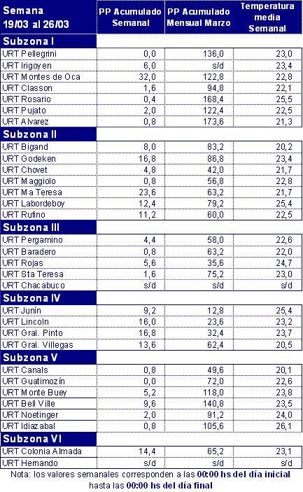 Durante los días comprendidos entre el jueves 26 de marzo y el miércoles 1 de abril, se esperan condiciones de tiempo estables, con escasa nubosidad, aumento de temperatura y sin precipitaciones. La presencia de un sistema de alta presión sobre el centro del país, y en las capas bajas y medias de la atmósfera, que se desplaza lentamente hacia el Este, no permite el desarrollo de nubosidad significativa para la generación de precipitaciones sobre el centro del país, concentrando las lluvias sobre el Sur de la región pampeana y el Norte argentino. Particularmente sobre GEA, las precipitaciones a lo largo del período serán nulas o poco significativas, con el agregado de que se esperan temperaturas relativamente altas para la época del año, ya que los valores máximos serán entre 30 y 32°C en los primeros días de la semana e irán aumentando hacia fines del período, alcanzando registros de hasta 34°C. En cuanto al viento, va a prevalecer del sector Este durante gran parte de la semana, rotando al sector Norte hacia el final del período. El contenido de humedad será alto, y estará concentrado en las capas bajas de la atmósfera, favoreciendo la formación de neblina y bancos de niebla, lo que permitirá sumar horas de mojado foliar a lo largo de la semana.