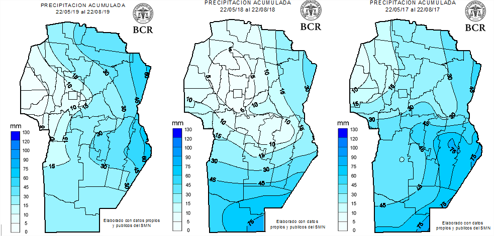 Las lluvias del trimestre frío se despiden mal del oeste, en los últimos 29 días de agosto no hubo registro de lluvias en Córdoba. Por eso no llama la atención que en toda la región centro, dónde más se acentúa la falta de agua es allí. En este momento, en el sur de la provincia deberían llover 80 a 100 mm para recomponer por completo la falta de agua. Pero hace un año, hacían falta 120 a 140 mm que ponían en dudas las posibilidades de hacer el maíz temprano sin reservas. La distribución era muy diferente entonces, la mayor necesidad estaba en el centro y norte provincial. Pero en la comparación, el trimestre frío del año pasado fue incluso más miserable en lluvias, sólo el 37% de la provincia alcanzó lluvias de 15 mm o más. En este 2019, el 64% de la provincia alcanzó a igualar o superar ese monto.