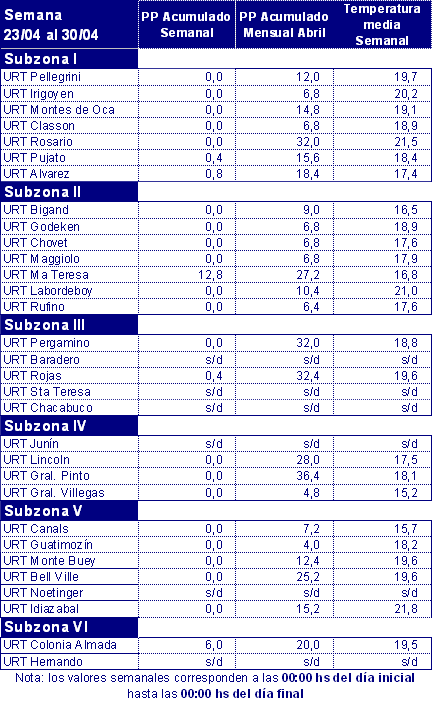 La primera semana de mayo de 2009 presentará condiciones muy secas, sin precipitaciones significativas en toda la región GEA. Durante este período será muy escaso el ingreso de humedad a la región, si bien el viento prevalecerá del sector Este o Noreste durante gran parte de la semana, la zona sur de Brasil y Paraguay también presentan condiciones secas, con bajo contenido de humedad tanto en los niveles bajos de la atmósfera como en las capas superficiales del suelo, por lo que no se espera que durante esta semana haya un aporte importante de humedad sobre el centro de nuestro país. En cuanto a las temperaturas, si bien comparadas con el período anterior serán inferiores, las mismas estarán por encima de los valores normales para el mes de mayo, tanto los registros máximos como los mínimos, por este motivo, no se esperan heladas durante este período en la región GEA.