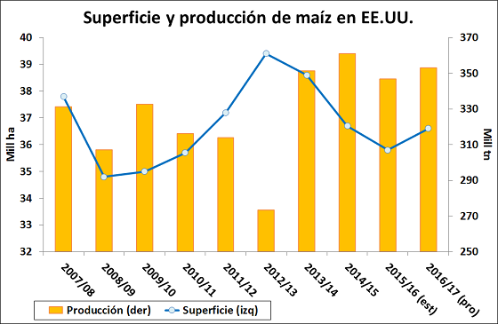 En tanto, sobre el cierre de la semana desde la oficina del Chief Economist del USDA se conoció una proyección preliminar de área a sembrar para el ciclo 2016/17 de 36,6 M ha, extensión que de concretarse implicaría un crecimiento de 850.000 hectáreas –el 2,4%- respecto de este año. La superficie de intención tendría entonces su primer incremento desde la campaña 2012/13, aunque es muy pronto para analizar el dato como definitivo. Los resultados de un relevamiento más detallado se conocerán recién en marzo de 2016 con el tradicional informe de «Prospective Plantings». Tomando rendimientos de tendencia ajustados por clima normal la producción de maíz se ubicaría por encima de 353 M tn, volumen que permitiría ampliar nuevamente la disponibilidad de inventarios.Ante esta situación, el desafío para el país del Norte seguirá siendo manejar sus enormes excedentes –con logística de almacenaje y transporte mediante- y recuperar participación en el comercio mundial. Esta última cayó de un promedio del 60% en la década pasada a sólo 38% en la actualidad, tendencia que a corto plazo parece difícil de revertir. A la amenaza que siempre significa Brasil se le suma la posibilidad de que Argentina vuelva con fuerza al mercado exportador con una eliminación de las retenciones al cereal, aunque la caída que sufrieron los planes de siembra para la campaña 2015/16 limita las posibilidades de nuestro país.