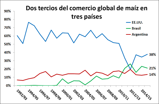El informe mensual del USDA marcó gran parte del pulso de la semana. El organismo redujo su previsión de exportaciones de Estados Unidos para la campaña en curso, reconociendo la elevada competencia que está sufriendo este origen en el mercado internacional. Este ajuste se acompañó con un incremento en la previsión de ventas externas de Brasil, de las que se espera un total de 32 M tn durante el período comprendido entre marzo de este año y febrero de 2016, un nuevo récord. La reducción en el volumen de exportaciones norteamericanas se compensó parcialmente con expectativas de mayor consumo doméstico, fundamentalmente de las fábricas de etanol. La producción del biocombustible alcanzó máximos históricos en el mes de noviembre.