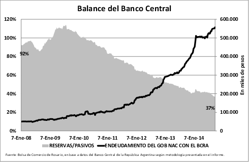 Las reservas internacionales, conforme la información contable presentada en el Balance del Banco Central, ascienden entonces a un 36,7% de los pasivos monetarios, en tanto que las reservas internacionales netas cubren un 22,8% de los mismos.