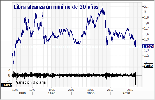 La primera plaza en reaccionar al suceso, dada la naturaleza continua de su operatoria, fue la de divisas. La libra registró su peor caída diaria frente al dólar desde el abandono de las resoluciones de Bretton Woods, colocándose en su nivel más bajo en 30 años (Gráfico 1).