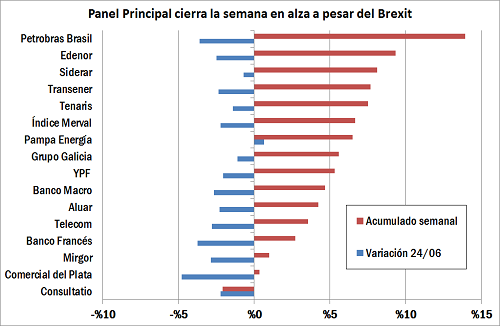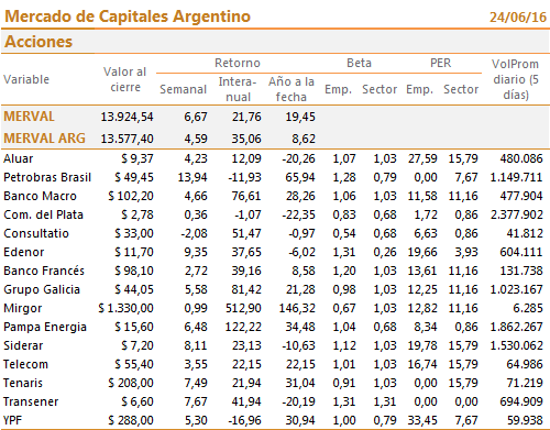 Un nuevo recorte en las tasas de las Letras del BCRA. Expectativas de que el referendo británico resultaría en la permanencia del Reino Unido dentro de la Unión Europea. Guiños de un escenario con un peso algo más débil. Estas fueron algunas de los fundamentals por los cuales inversores demandaron vorazmente cualquier activo de renta variable (o fija denominada en dólares) a disposición hasta la jornada del jueves.