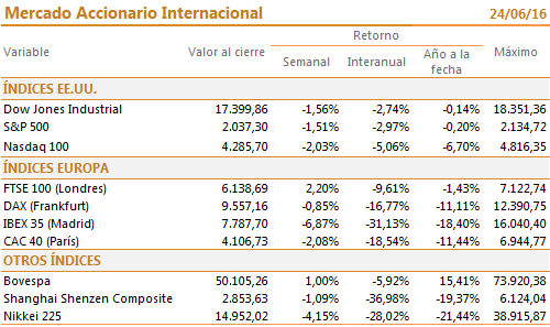 Cuando la semana apuntaba a cerrar como una de las mejores del año para los mercados de renta variable, la población del Reino Unido pateó el tablero votando a favor de la salida de dicho estado de la Unión Europea, enviando a los índices accionarios en picada e incrementando el apetito por deuda soberana.