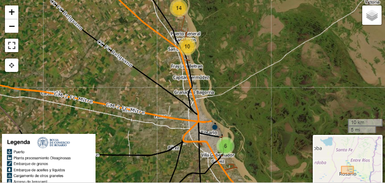 De estas 29 terminales portuarias, diecinueve (19) despachan granos, aceites y/o subproductos. Dentro de este grupo, 12 terminales tienen plantas de molienda de oleaginosas en sus inmediaciones. La nómina de estas 19 terminales portuarias se encuentra en el cuadro N°1 que adjuntamos en esta nota. Desde esta área geográfica se despachan anualmente entre el 77 y el 80% de las exportaciones argentinas de aceites, granos y subproductos.