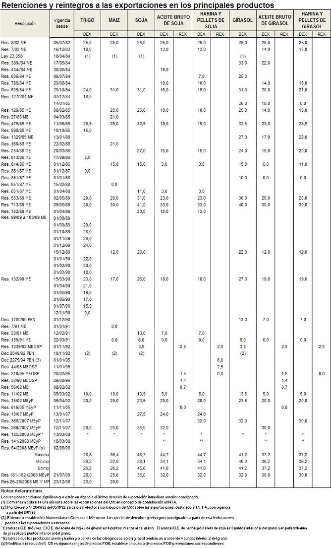 En enero de 2007 la resolución 10/07 del Ministerio de Economía y Producción incrementó las alícuotas en 4 p.p. para el complejo soja, quedando en 27,5% para el grano y 24% para los subproductos. Esta vez la medida se apoyó en el hecho de que la «demanda crece de manera sostenida» y tras su aplicación «la rentabilidad del sector productivo seguirá siendo adecuada». Meses más tarde, tras las elecciones nacionales de 2007 el gobierno saliente modificó todo el esquema, esta vez en la búsqueda de «reducir los precios internos, consolidar la mejora de la distribución del ingreso y estimular el mayor valor agregado». El maíz comenzó a pagar un derecho de exportación del 25% y el trigo del 28%, mientras que las alícuotas de girasol y soja se incrementaron hasta 32 y 35%, respectivamente, con 3 p.p. de diferencial arancelario para los productos de primera transformación industrial.