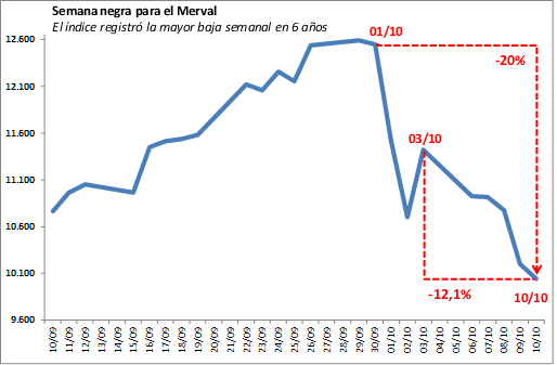 Final de una semana negativa por donde se la mire desde los mercados financieros. Las crecientes preocupaciones por la evolución de la economía europea tiñeron de rojo las pantallas que siguen los principales índices bursátiles a nivel global. A nivel regional, la alegría fue sólo brasilera (aunque modesta). En lo que hace al mercado local, en medio de una creciente incertidumbre y presionado por la cotización del dólar en sus distintas versiones, el Merval anota su mayor caída semanal en 6 años y pierde 20% en lo que va de octubre.